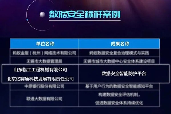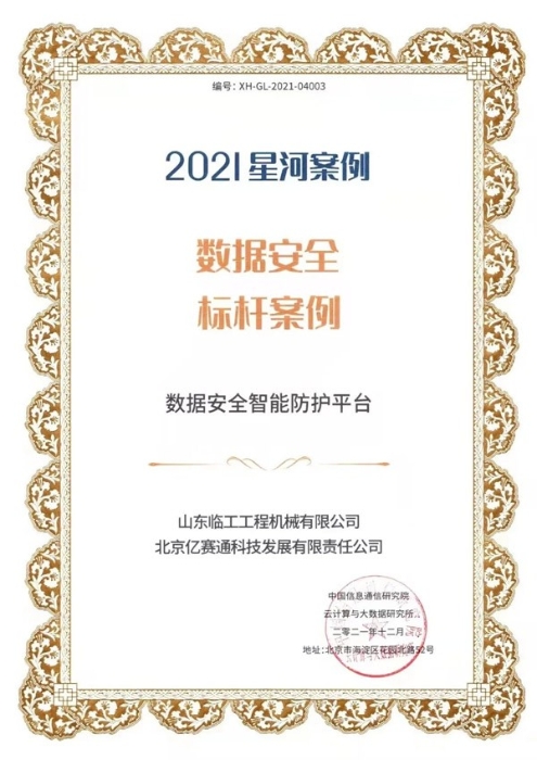 山东完美.(中国)体育官方网站-365WM SPORTS工程机械有限公司和北京亿赛通科技发展有限公司联合申报的“数据安全智能防护平台”应用成果凭借其专业的技术及完善的解决方案,从350余份项目中脱颖而出,成功当选本届大数据星河案例“数据安全标杆案例”。